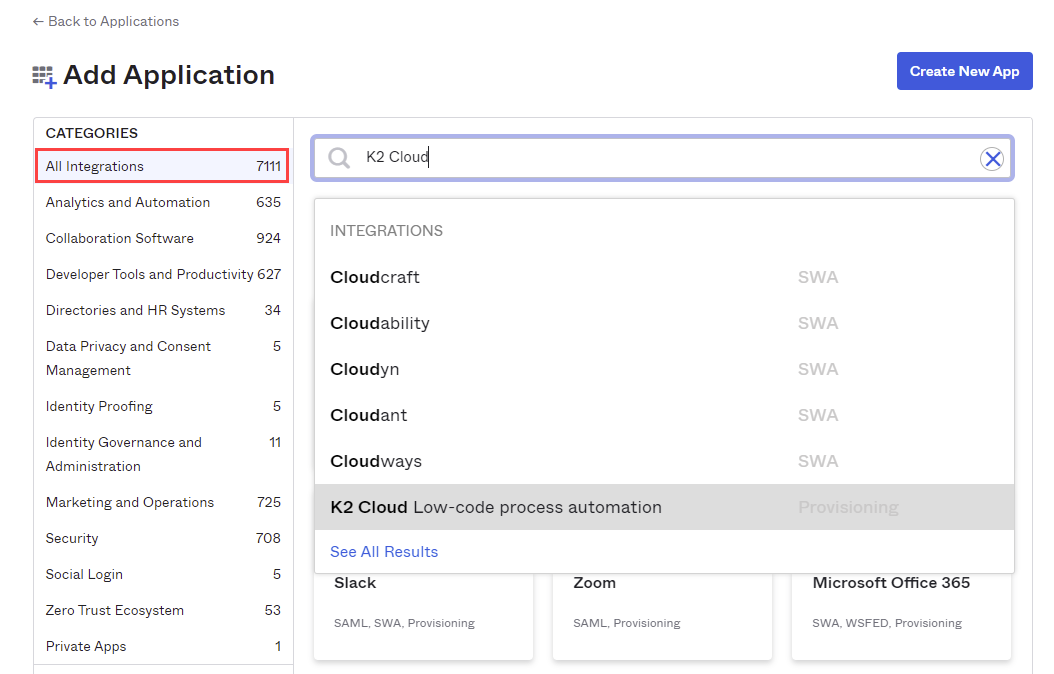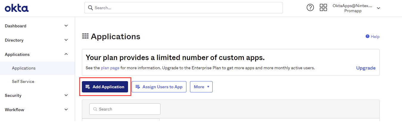 - Log in to Okta and add the Nintex K2 Cloud app by clicking Add Application: