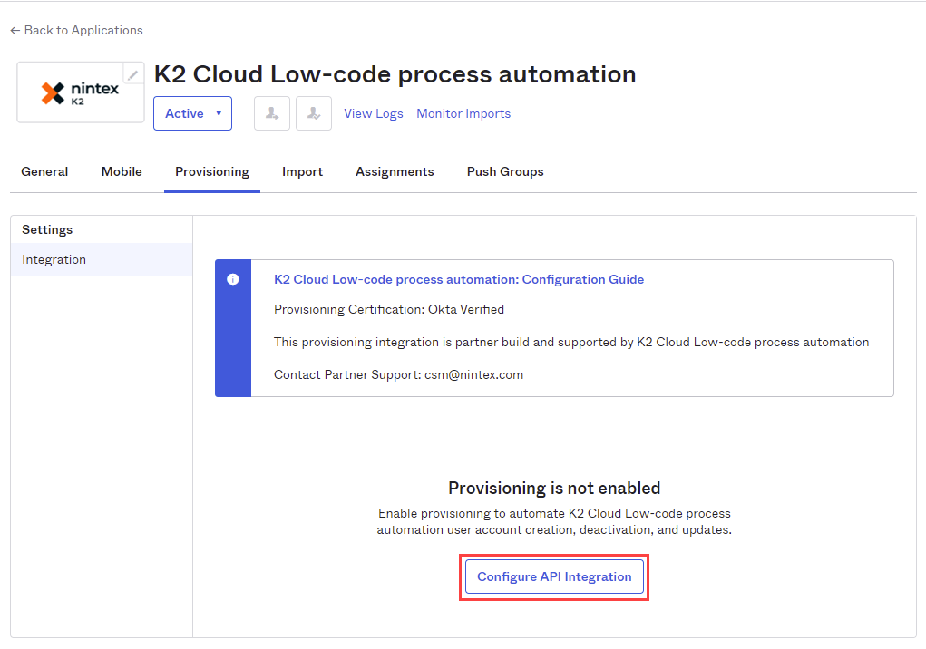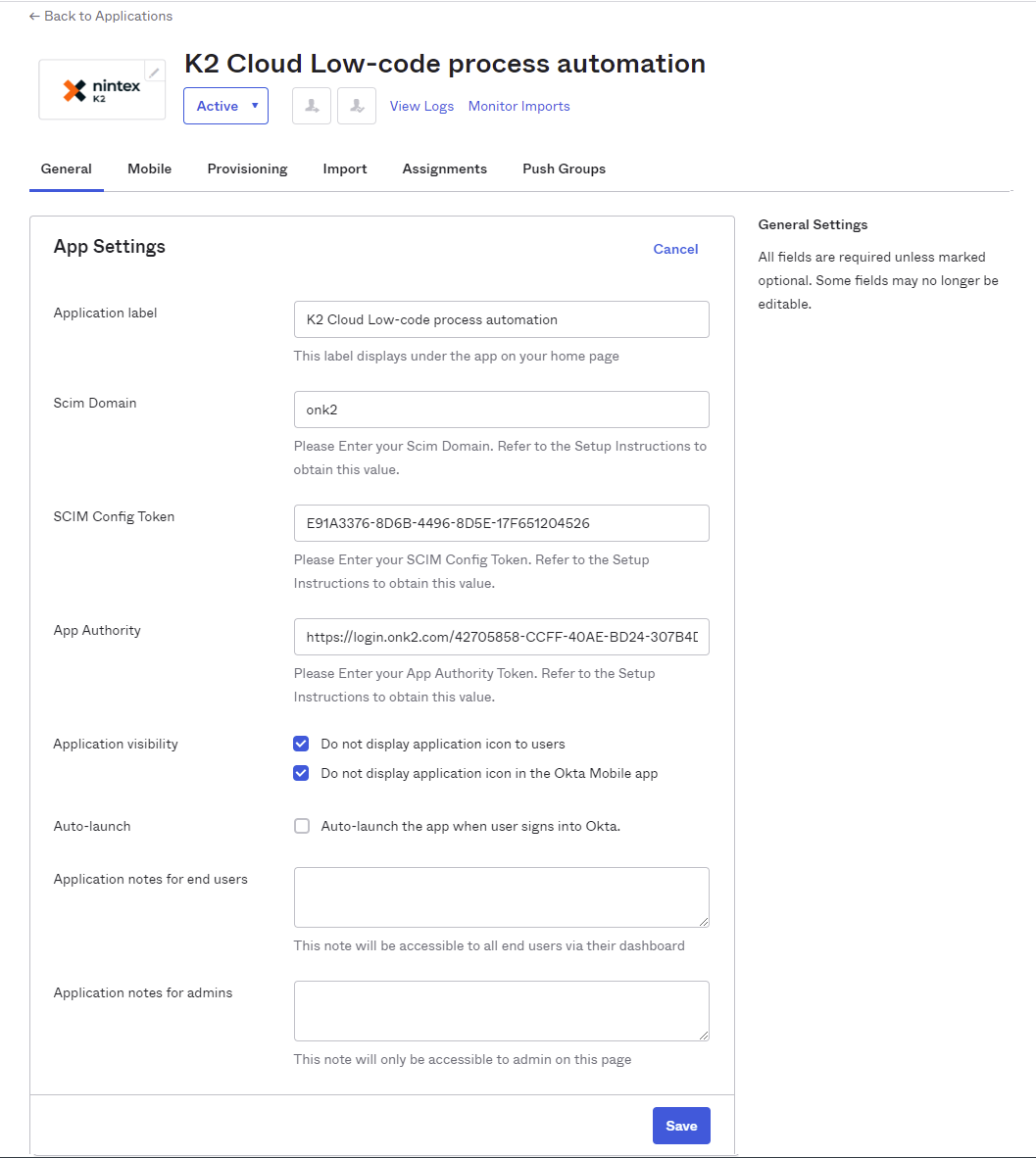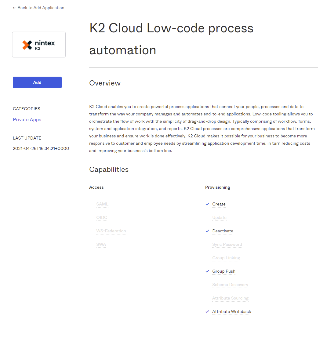 Use this guide to configure and install the Nintex K2 Cloud app in Okta. The app lets you use OAuth 2.0 Authorization Code grant flow as your method of authentication and SCIM as your method of identity provisioning.