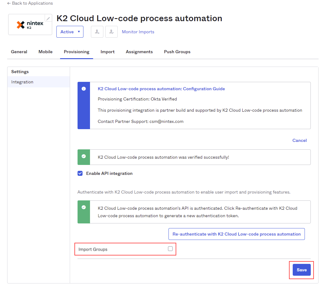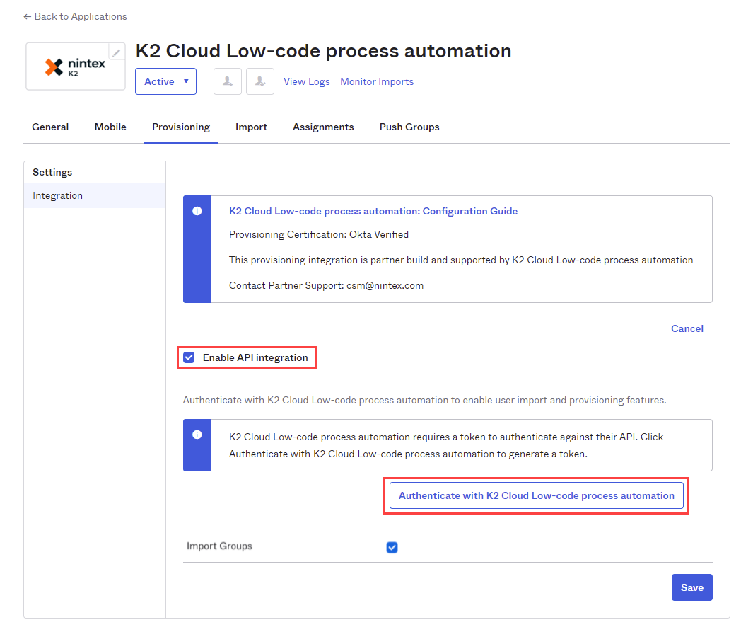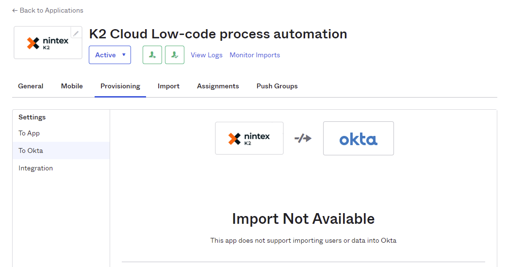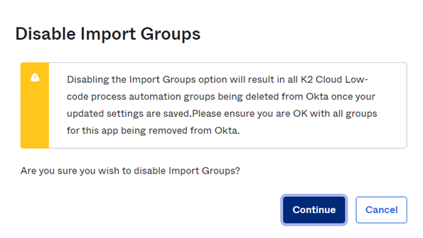 You are returned to the Okta provisioning page after logging in. - Uncheck the Import Groups check box. The Nintex K2 Cloud identity sync service does not support Okta importing groups from Nintex K2 Cloud. Click Continue in the pop-up dialog, then click Save to continue.