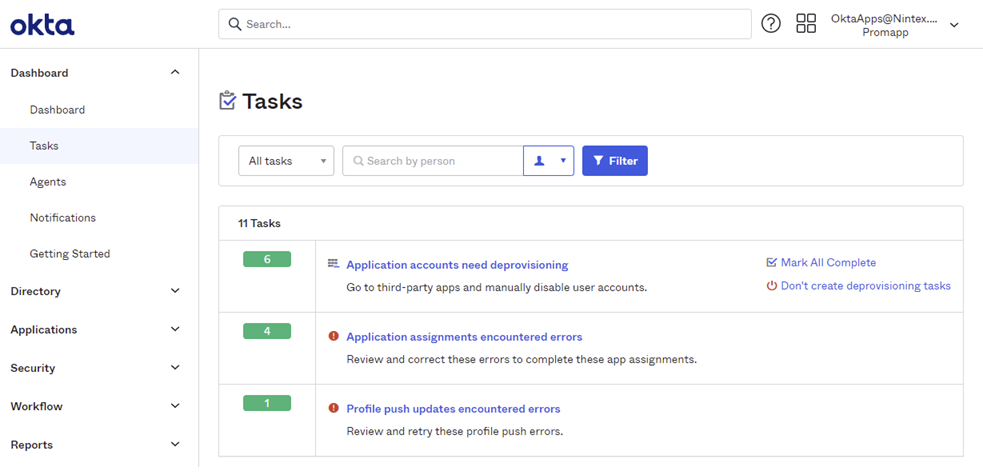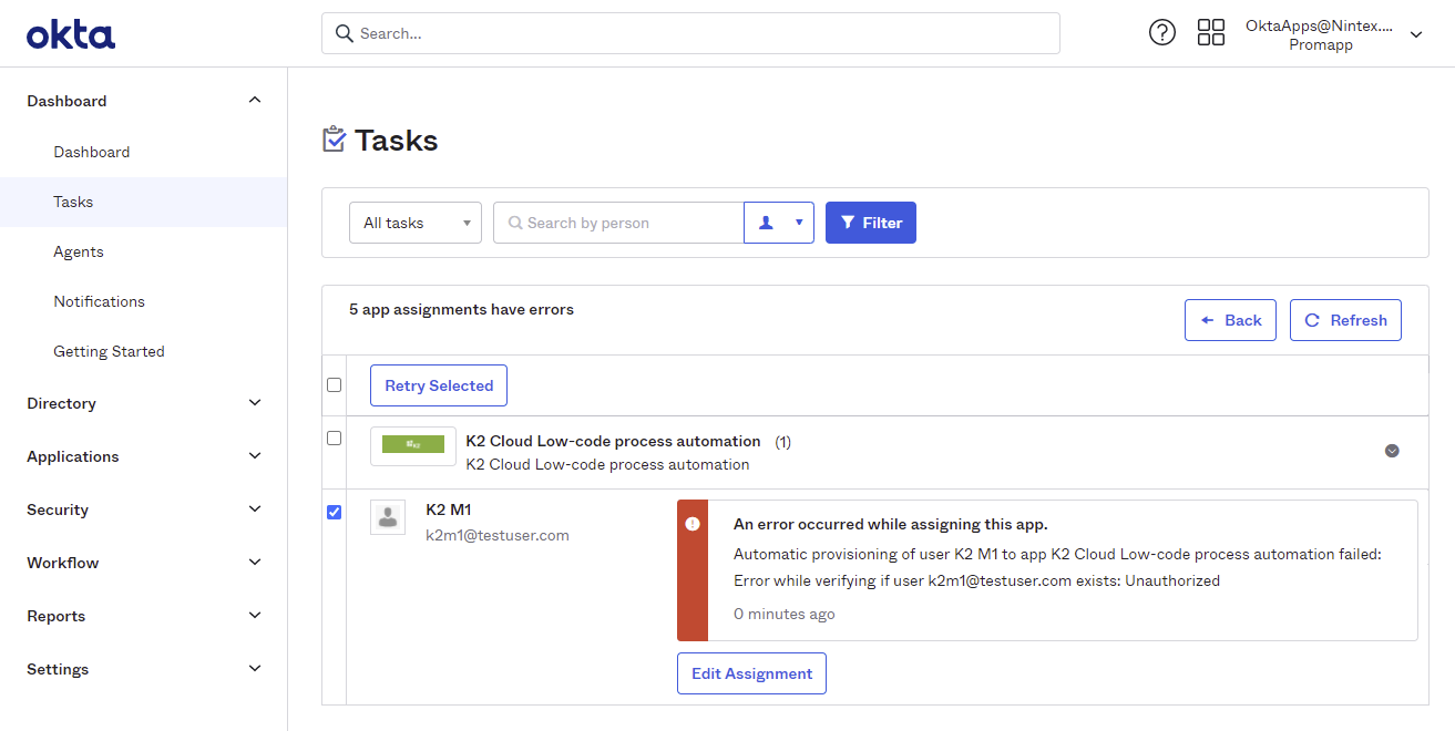 Use the Okta Dashboard to check for provisioning errors that occurred during the assignment of people and groups, or while pushing groups. You can retry the action that caused the error and if that does not correct the issue, log a ticket with Nintex support. The following points show an example of error checking.