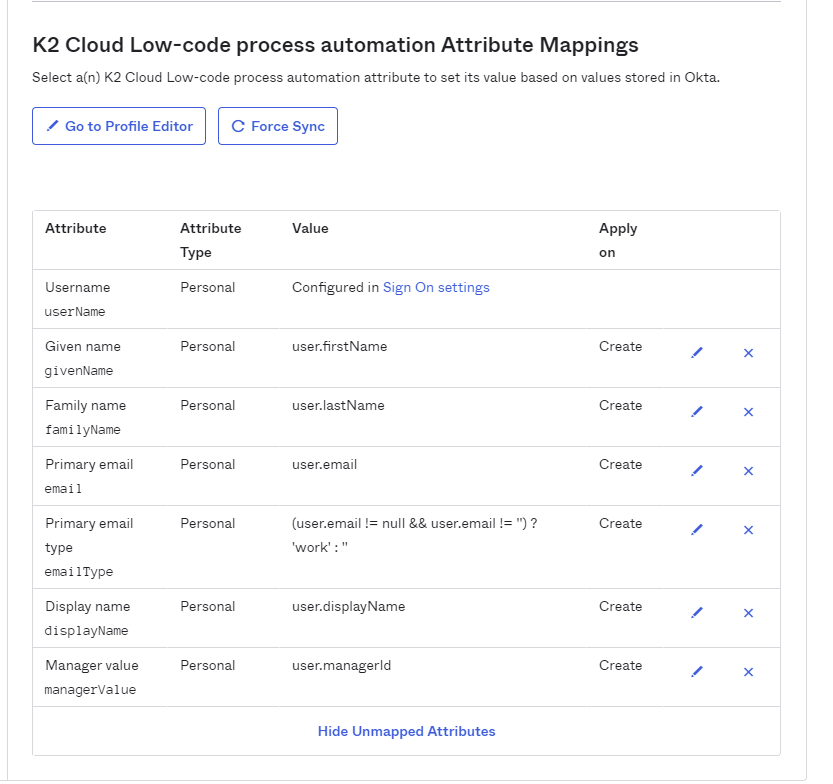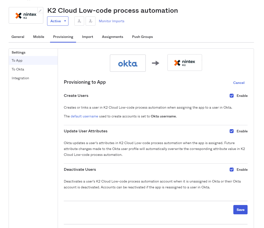 The Nintex K2 Cloud identity sync service does not support Okta importing users from Nintex K2 Cloud. In Okta, on the To Okta page, leave the default configuration.