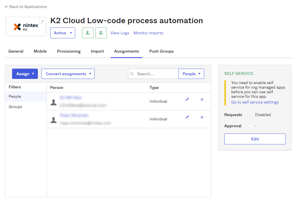 After creating the Nintex K2 Cloud app, you must assign people, groups, and group membership details to it for provisioning. Assign people and group names from the Assignments tab, and create the group membership details from the Push Groups tab. This section describes the process for both.
