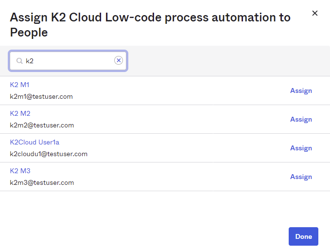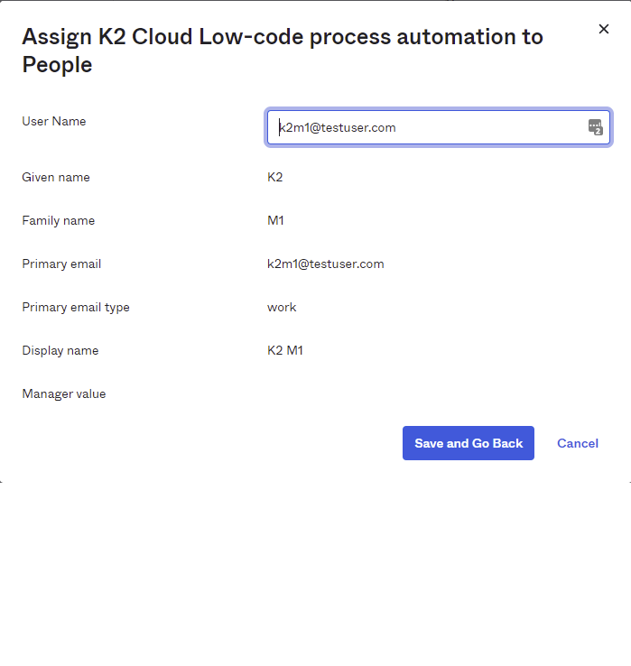 - Click Save and Go Back to assign another person, or click Done when you have assigned everyone you want to. Note that only the supported Nintex K2 Cloud attribute mappings as listed above in supported Attribute Mappings will apply during the provisioning into the Nintex K2 Cloud Identity Database.