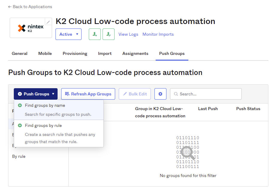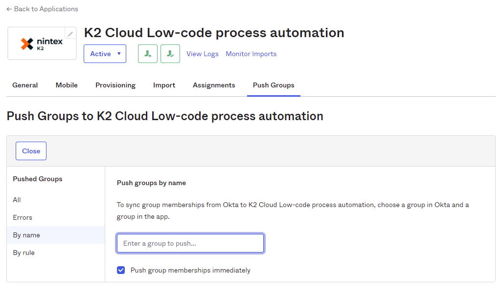 Assign groups to the Nintex K2 Cloud app using the same steps as when assigning people, as described in the section above. Okta will only provision the members of that group into the Nintex K2 Cloud Identity Database, the group itself will not be provisioned. To provision groups, use the Push Groups tab.