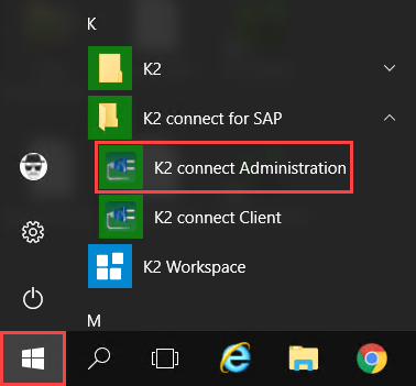 - Launch the K2 connect Administration console. (Start > scroll to K > K2 connect for SAP > K2 connect Administration)