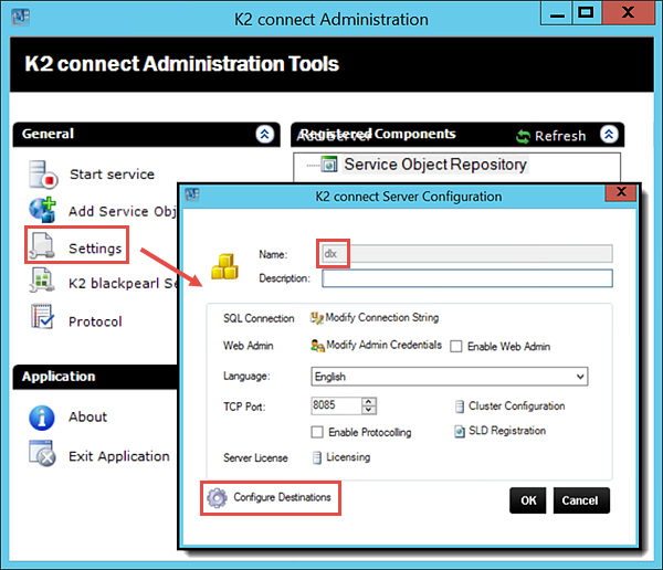 - Once the console has loaded, click Settings. Notice that you are connected to the dlx machine (with dlx being the machine name of the virtual environment). If you are working in your own environment, your machine is likely to be different. On the K2 connect Server Configuration screen, click Configure Destinations to begin setting up the new destination.