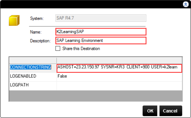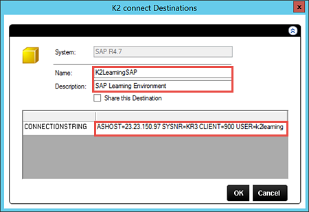 - Connection String: ASHOST=23.23.150.97 SYSNR=KR3 CLIENT=900 USER=k2learning PASSWD=K2pass!
