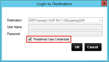 Notice that the connection string contains the username and password required for the SAP credentials. We can embed the credentials in this manner or we can configure the K2 connection to the SAP environment to use single sign-on. We will expand on these options in a later step.