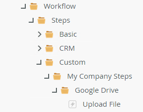When you create a custom step, you specify its position in the toolbox (the Toolbox Path field in the custom steps management form). You can specify up to two levels, for example, My Company Steps\Google Drive. If you don't want nested steps in the toolbox, specify the step location as Google Drive. When you create the step, the Toolbox Path is also created if it doesn't already exist. The Toolbox Path is created as sub-folders under the Custom folder in the category tree.