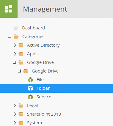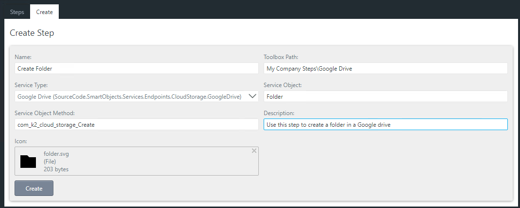 This example demonstrates creating and using a custom step in a workflow. In this example you create a custom step for the Create service object method of the Folder service object of a Google Drive feature instance. The Create Folder step creates a folder in the Google Drive Service Instance created when using the Google Drive feature activation.