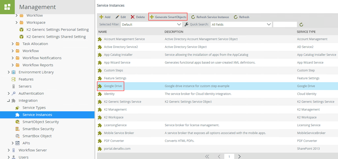 - If you haven't already done so, activate an instance of the Google Drive feature. See the topic in the K2 User Guide for more information. This will generate the Service Objects and SmartObjects that you need to use.