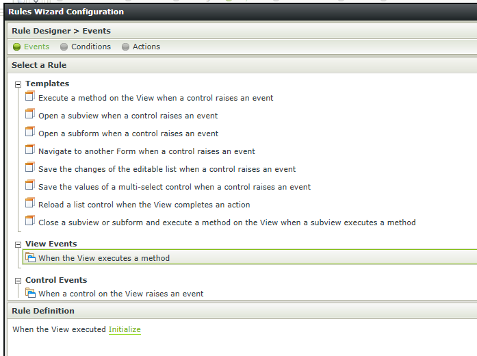 - Select the When the View executes a method rule from the View Events node.