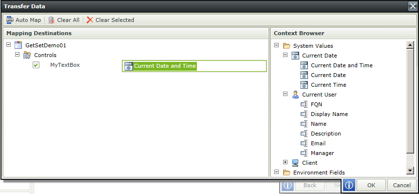 Configure the Transfer Data rule to load the Current Date and Time (drag and drop this field from the System Values>Current Date node in the Context Browser).