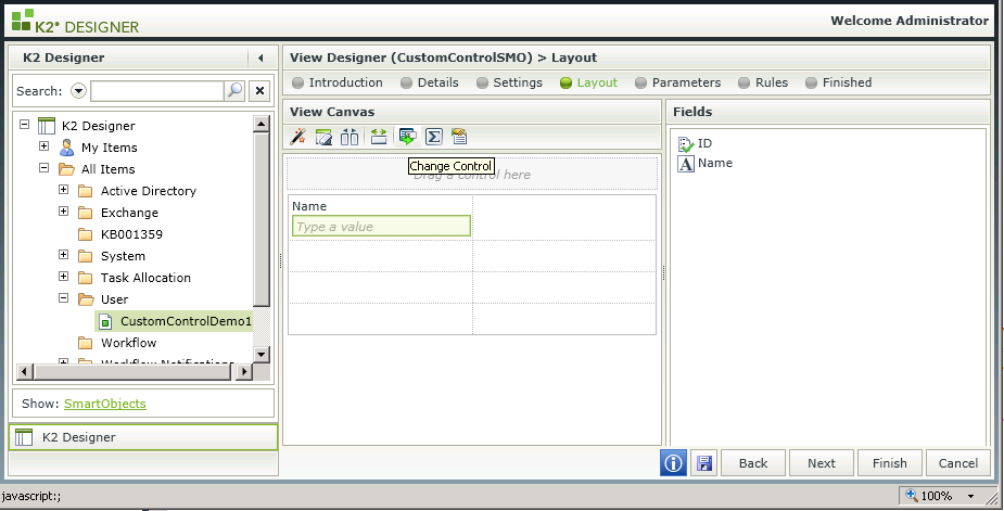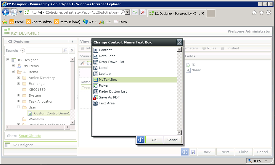 Configure a K2 smartforms View with the MyTextBox Custom Control