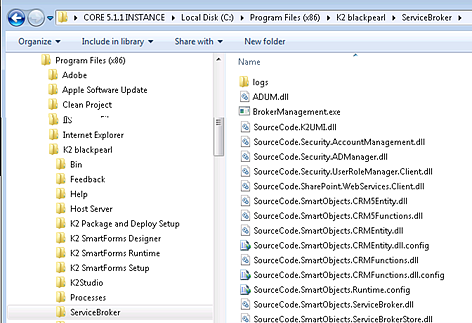 Service Broker Dll's reside in the "%PROGRAMFILES%\K2\\ServiceBroker" directory on the K2 Application servers. The screenshot below shows the location of the Brokers