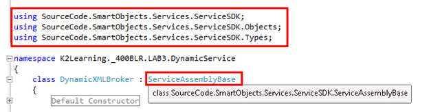 Next inherit the base class SourceCode.SmartObjects.Services.ServiceSDK.ServiceAssemblyBase in your project. We recommend creating a separate .cs class for the base class to separate the Broker code implementation from the class you will expose as a ServiceObject.