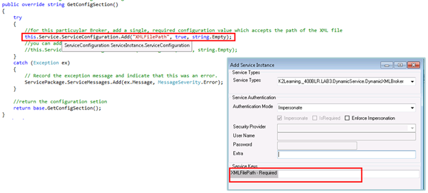 You add configuration values by overriding and implementing the base class' GetConfigSection() method. For each configuration setting in your Service Broker, add it to the Service Configuration items. Examples below.