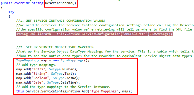 We recommend implementing the DescribeSchema in two separate methods. The override implementation of DescribeSchema() gathers configuration settings, sets up Type Mappings and sets up the Service Instance after the Service Objects have been discovered and added. The actual discovery of the Schema is performed by a helper method. The helper method will discover the Objects in the Provider and then add Service Objects for each object that we want to expose in the Service Broker.