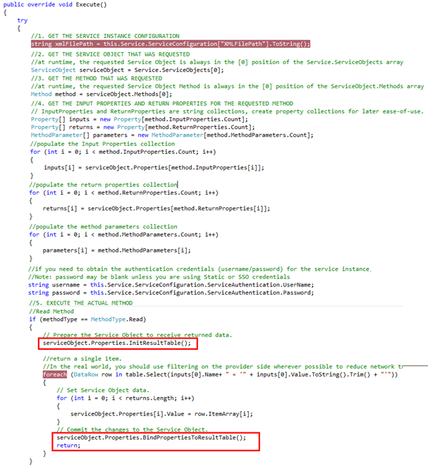 Finally, override and implement the Execute() method in the ServiceAssemblyBase base class. This method is called at runtime whenever a SmartObject interacts with your Service Broker. Note that, regardless of the method called this is always the entry point into your Broker, so you will need to examine the request to determine which Service Object and Method was requested, and what the input properties, parameters and return properties are. You will then usually call out to helper methods to perform the interaction with the Provider.