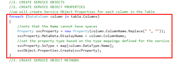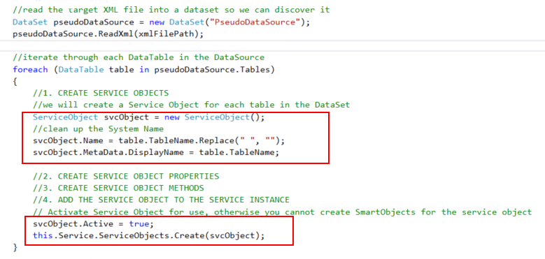 The actual discovery of the Schema is performed by a helper method. The helper method will discover the Objects in the Provider and then add Service Objects for each object that we want to expose in the Service Broker. In the example below, we are querying a .NET DataSet to determine the Service Objects that should be added. For a different provider, the discovery process may be different.