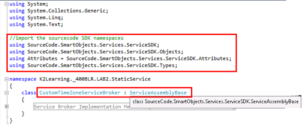 Next inherit the base class SourceCode.SmartObjects.Services.ServiceSDK.ServiceAssemblyBase in your project. We recommend creating a separate .cs class for the base class to separate the Broker code implementation from the class you will expose as a ServiceObject.