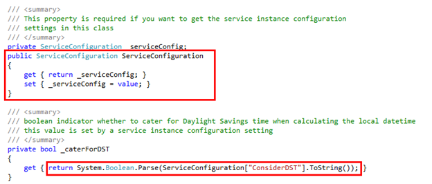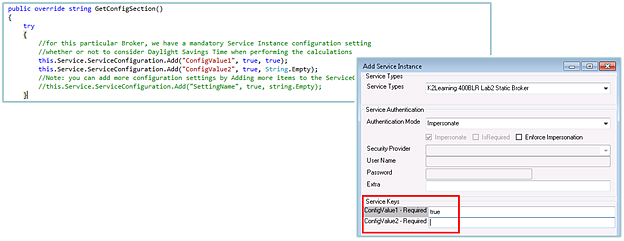 At runtime, you can expose the Service Instance's configuration settings by declaring a property of type ServiceConfiguration in your class. K2 will automatically pass the service instance configuration settings into this property at runtime. You can read the configuration values like this: