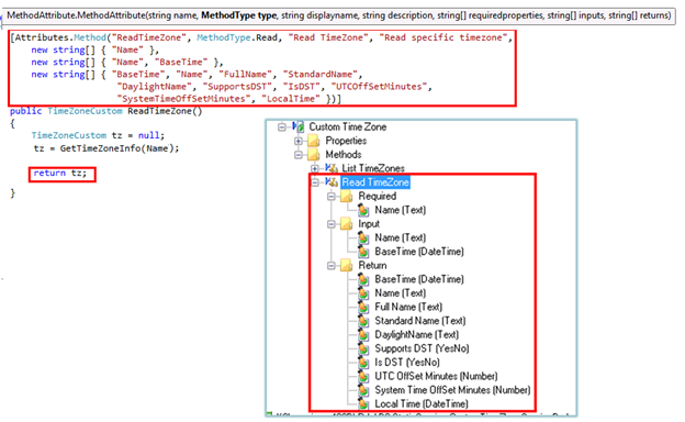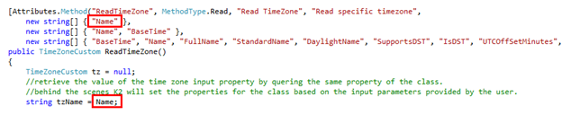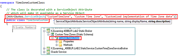 Here is an example: suppose you have a class library in your organization that exposes Time Zone information. This TimeZone object has properties like Name, UTCOffset and Abbreviation and methods like Read TimeZone and List TimeZones. We don’t expect that the definition or Schema of the TimeZone object will ever change. Now imagine that we wanted to create a Service Broker that exposes this custom TimeZone object so that we can create SmartObjects for TimeZones. Since the Schema of our TimeZone object never changes, we can create a static Service Broker which describes the TimeZone as a Service Object. Essentially, the description of the Service Object is hard-coded into the Service Broker code.