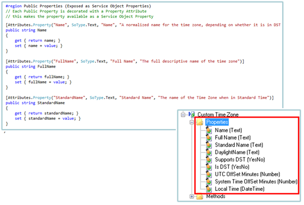If necessary, create public properties for each property of the Service Object. Decorate the public properties that you want to define as Service Object properties with the [Attributes.Property] Attribute. As part of the attribute, you will need to specify what Service Object Type the Property will be, .e.g Text, YesNo, DateTime and so on.