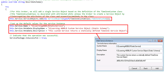 Next you will need to override and implement the DescribeSchema() method in the ServiceAssemblyBase base class. This method is called when you register or refresh a Service Instance, and it is used to list the available Service Objects for a Service Broker. Note that you will manually register or refresh a Service Instance to call this method. K2 does not "poll" or otherwise automatically update the list of Service Objects in a Service Broker.