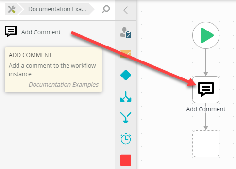 Field Description Name Add Comment Toolbox Path Documentation Examples Service Type Workflow Service (SourceCode.SmartObjects/Services.Workflow.WorkflowService) Service Object Workflow Comment (WorkflowComment) Service Object Method Add Comment (AddComment) Description Add a comment to the workflow instance Icon Upload a 32x32 .svg file. Sample: