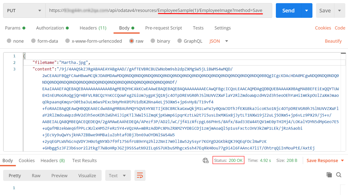 Use the odata.mediaReadLink key's value (the URI) to view or download the file or image with the HTTP GET method. Also, use the same link to PUT a file or image when doing a Save or Update. The URI to use is like the Sample response shown above: "https://***********.com/api/odatav4/resources/EmployeeSample(1)/EmployeeImage". Yours will be different:
