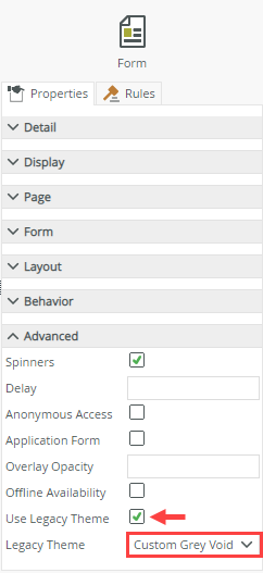 - Edit the Form, and select your custom theme from the Legacy Theme drop-down in the Form Properties' Advanced section. Make sure the Use Legacy Theme option is selected. Save and finish the Form.