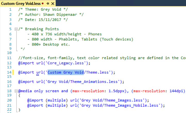 - Open the main .less file for the copied theme (Custom Grey Void.less in this example) in a text editor, and replace all instances of Grey Void with your new theme's name (Custom Grey Void in this example).