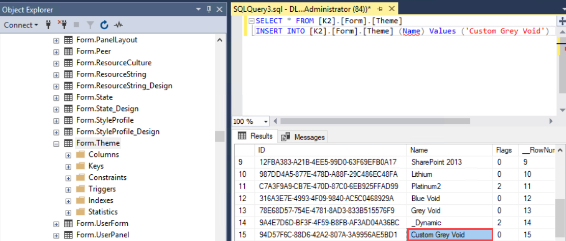 To register your custom theme in a K2 environment, you must add a new row to the Form.Theme table in the K2 database. You only need to register the custom theme once on each K2 environment where the custom theme will be used.