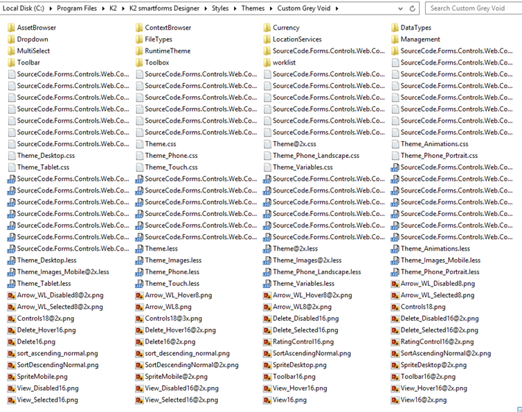 | K2 Designer site | %PROGRAMFILES%\K2\K2 smartforms Designer\Styles\Themes |