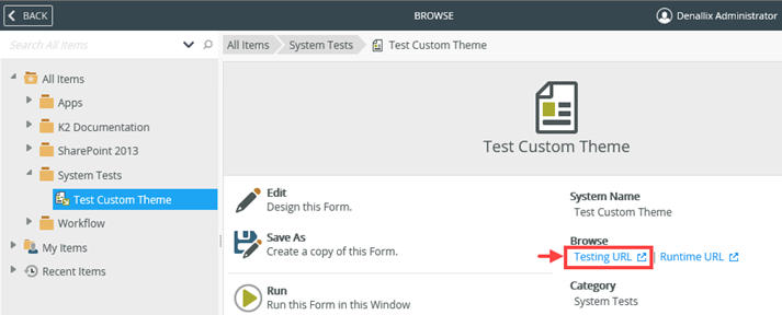 - Return to the form Browse page by selecting the form in the context browser. On the form browse page, launch the form in testing mode by clicking the Testing URLlink on the Form's landing page. (Make sure to use the Testing URL since this will make the form launch in the Design site where your custom theme exists. If you click on Runtime URL, the form will launch in the runtime site, and your custom theme may not exist or be updated in the runtime site yet).