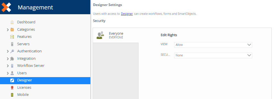 | Security | You can a assign Security rights to K2 Designer, which allows others to manage K2 Designer security, including assigning View and Security rights for other users. |