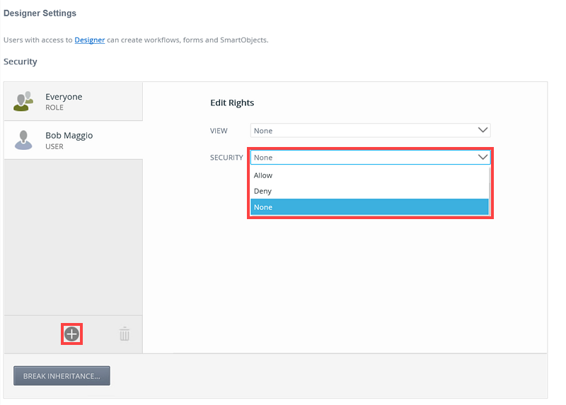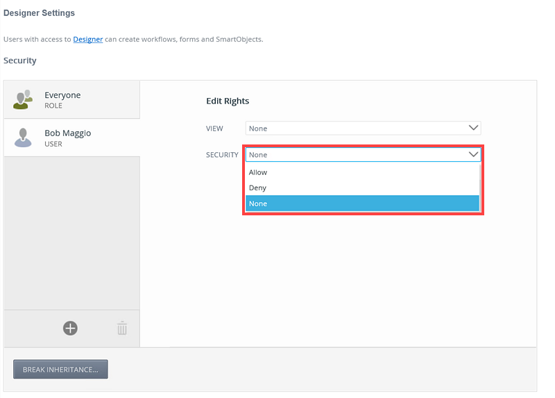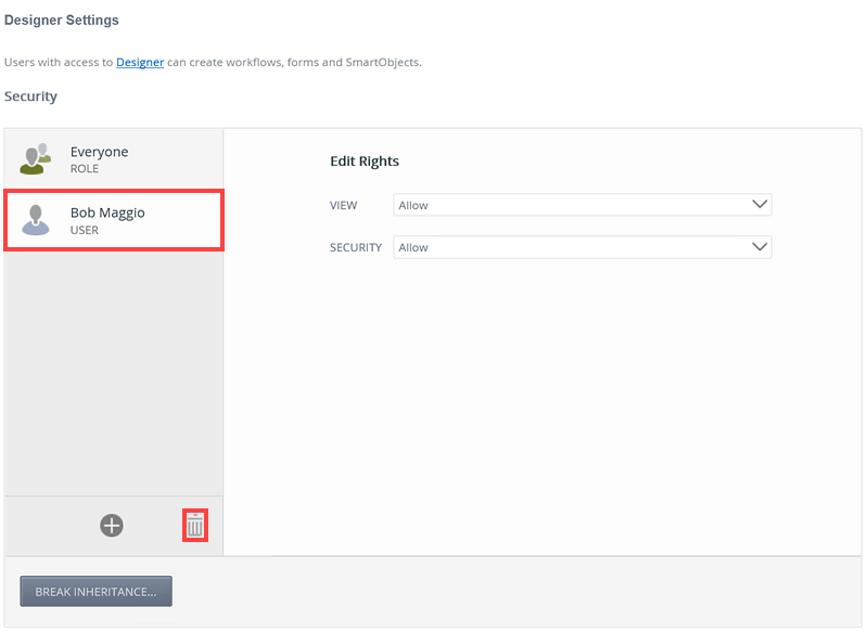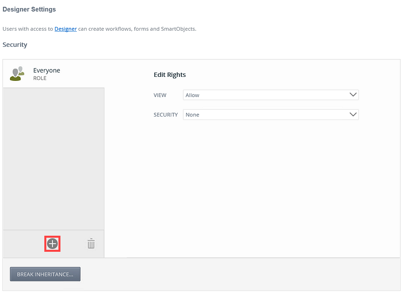 - Add more users, groups and roles to the Security page if required. When specifying users and groups for K2 Designer authorization, the Everyone role is added by default, providing all authenticated users in your organization, the ability to view K2 Designer. Best practice would be to remove the Everyone role from the K2 Designer authorization (By clicking the Break Inheritance button, select everyone role and clicking the Trash Can icon) and add users, groups and roles according to your organizations requirement.