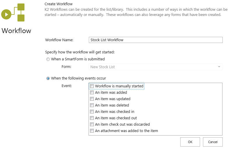 When the following events occur: Start your workflow after one or more selected SharePoint events occur, even if those events are not driven by a user interaction. Use this option to automatically start a workflow when other applications or users create a new item in the SharePoint List or Library. Select from events such as adding, updating or deleting an item.