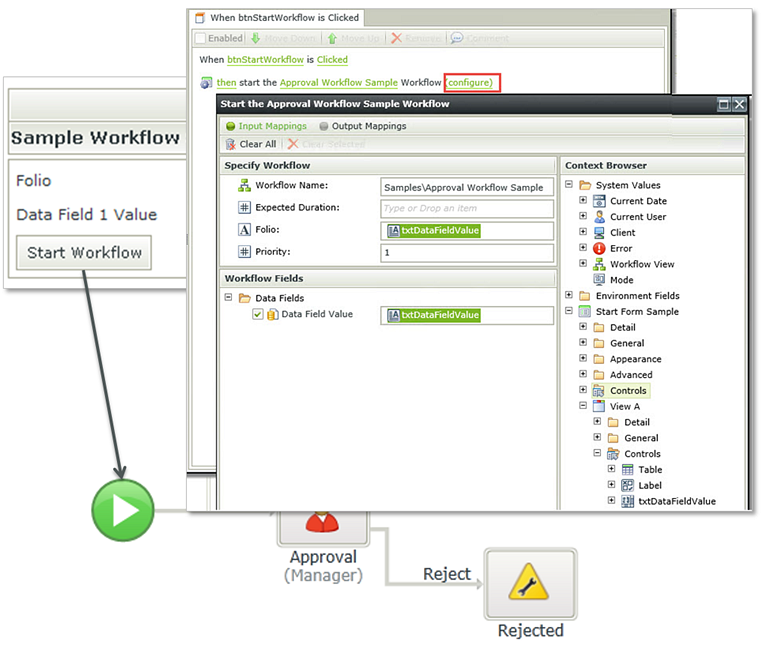 Start Forms use the Start a Workflow action to start a Workflow. This action is usually contained in a Rule for a Button Click event or some other user-driven event. In the example below, the Start Workflow button’s Rule calls the Start Workflow action to start the sample Workflow.