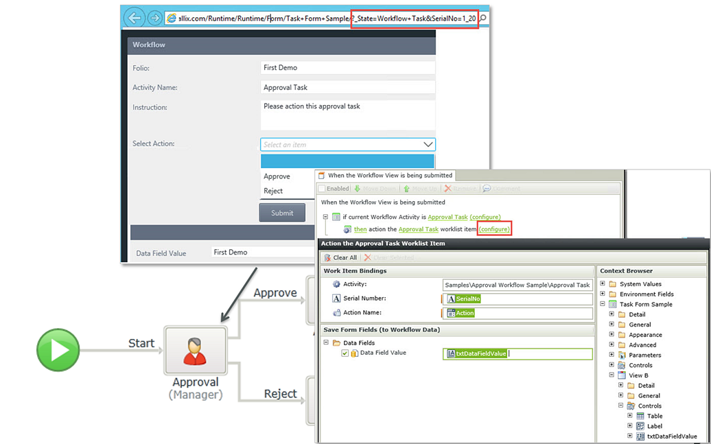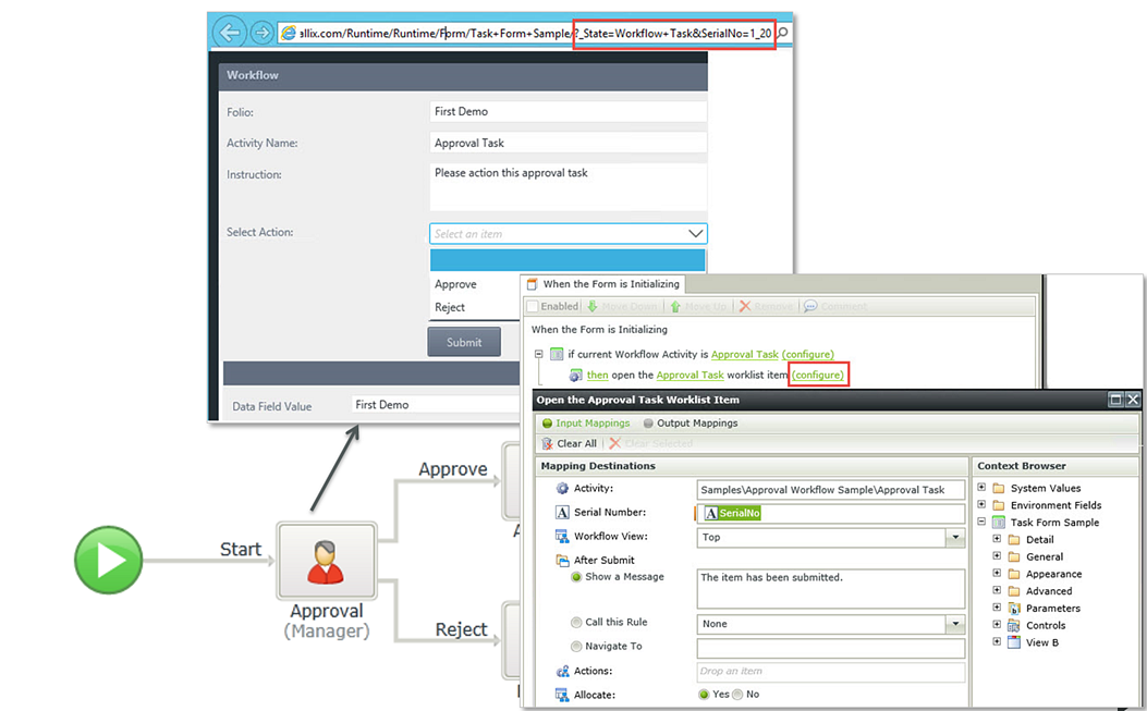 The first step is to open the associated task with the "Open a worklist item" action, using the Serial Number to locate and open the workflow task. This rule is usually executed when the Form is initialized, and would usually also read the available actions for the task so that these can be presented to the user in some way, normally a drop-down menu. You can also read data from the Workflow instance, like the Folio or data field values.