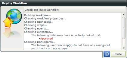 Selecting Deploy initiates a build Workflow. If the build is successful, the workflow is then deployed to the K2 Server. If the build is not successful, a message is displayed with the error details