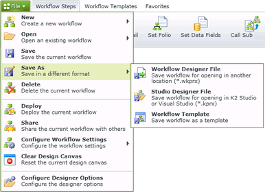 The Workflow Designer File option saves the workflow to a Workflow Designer file which can then be opened in another location. To access this functionality select the Workflow Designer File option from the File Menu.