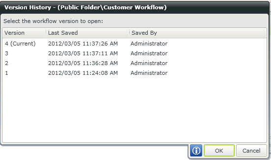 Clicking the History link in the History column will open the Version History screen, allowing the user to revert to any other version of the workflow, see below: