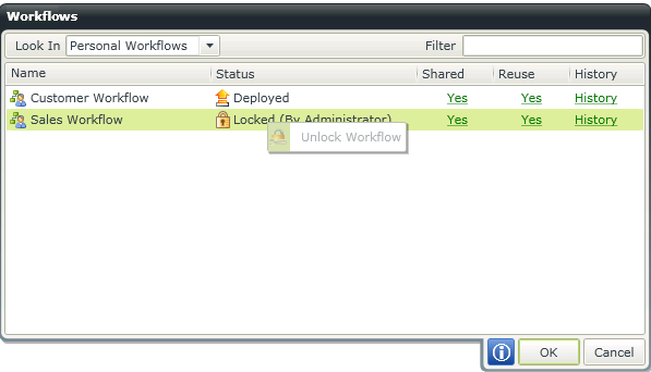- If a workflow is locked it can only be unlocked by the original designer of the workflow who shares the workflow