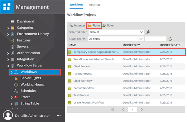 - From the Management menu, expand the Workflow Server node, then click on Workflows. All of the current workflow projects will be displayed in the central pane. Locate the Temporary Access Application Workflow project, then click it so that it is highlighted. Click the Rights button in the top toolbar.
