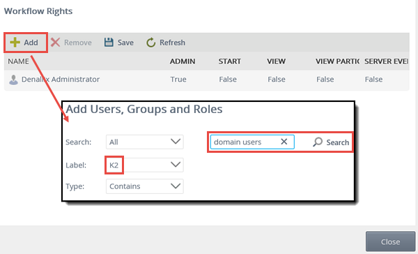 - On the Add Users, Groups and Roles screen, change the Label to K2 (if necessary), then enter