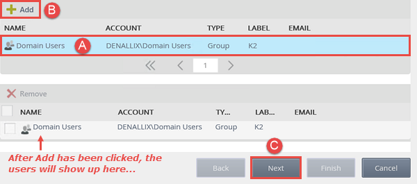 into the search text box and click the spyglass or Search button. - The results pane on the Add Users, Groups and Roles screen will display any search results that K2 finds. Click to highlight the Domain Users search result, then click Add once again to select the domain users. Click Next.