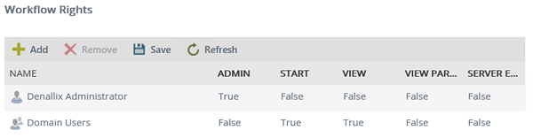 You should see that the deploying user has ADMIN rights on the workflow, and domain users now have START and VIEW rights.