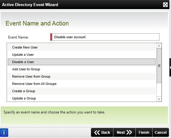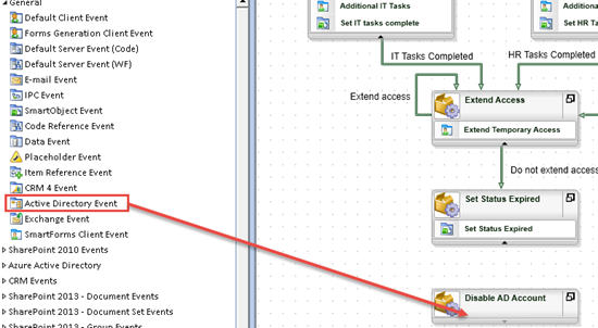 In this step, you added an event that will disable the account of the temporary user, using the AD UserName property to find the correct account.